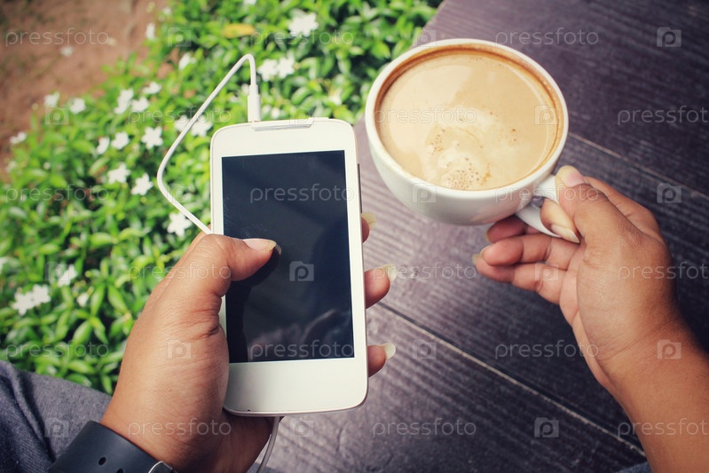 Женщина играет смартфон с наушником и кофе в саду