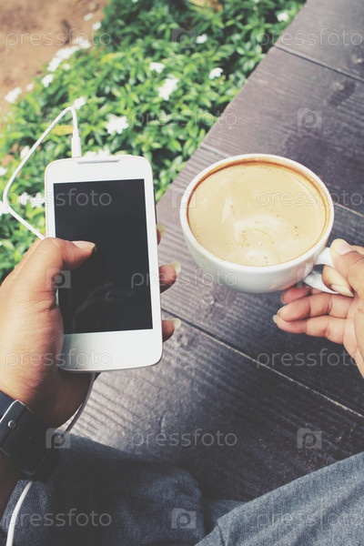 Женщина играет смартфон с наушником и кофе в саду