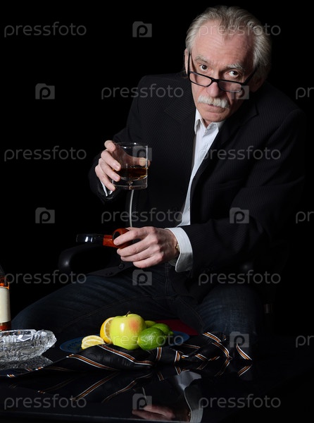 Пожилой человек с бокалом виски на черном фоне