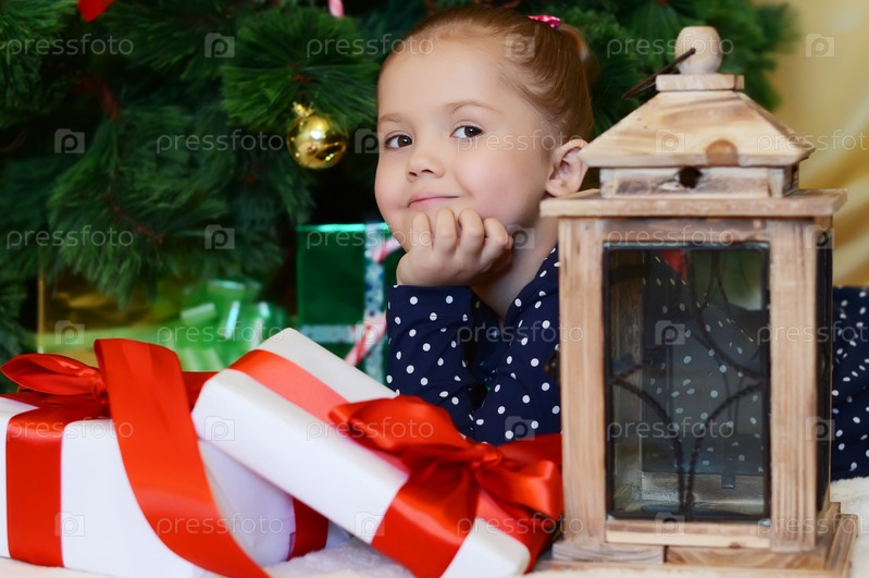 Маленькая девочка в Рождественская елка с подарками