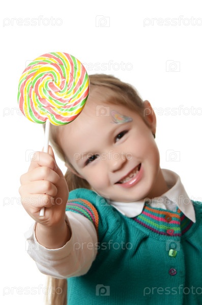 Маленькая девочка с леденец, изолированные на белом фоне