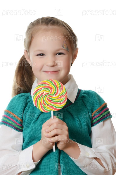 Маленькая девочка с леденец, изолированные на белом фоне
