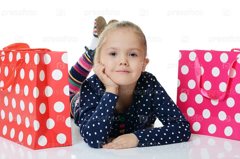 Маленькая девочка с двумя пакетами, изолированные