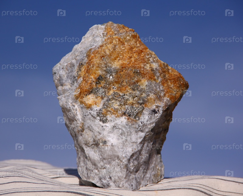 Образец золотосодержащей пирит-кварцевой жилы на фоне неба