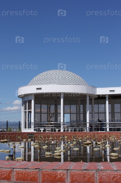 Веранда ресторана и конструкция фонтана на первом плане. Улан-Удэ
