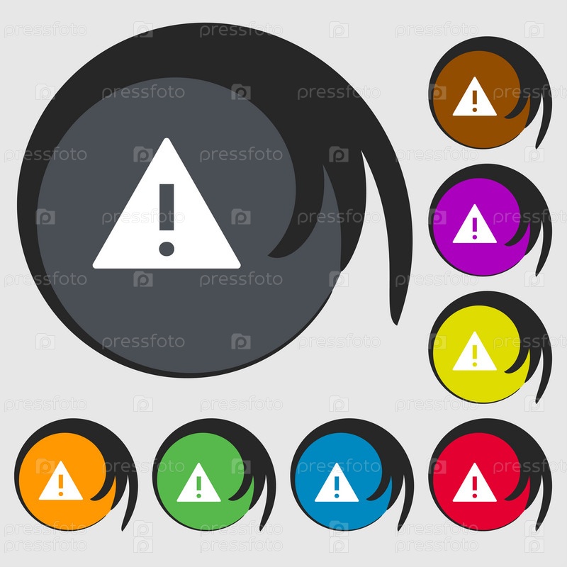 Изображение знака внимания. Восклицательный знак. Символ предупреждения об опасности. Символы на восьми цветных кнопок. Вектор