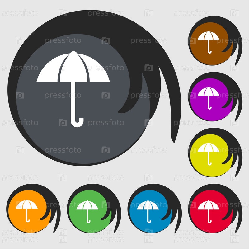 Зонтик знак значок. Символ защиты дождя. Символы на восьми цветных кнопок. Вектор
