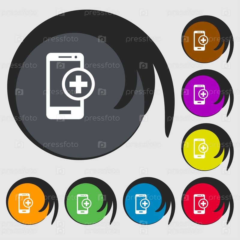 Мобильные устройства значок. символ плюс. Символы на восьми цветных кнопок. Вектор