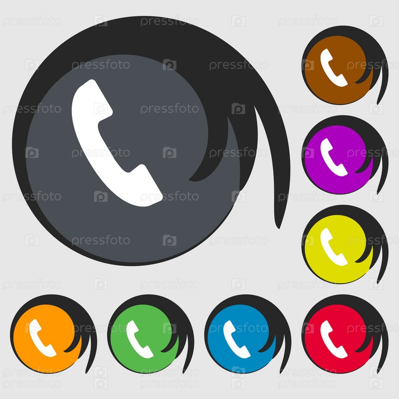 Знак значка телефона. Символ поддержки. Центр вызовов. Символы на восьми цветных кнопках. Вектор