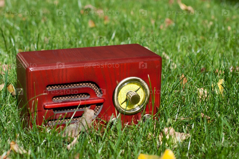Винтажный радиоприемник, стоящий на зеленой лужайке