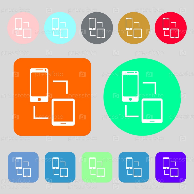 Знак значок синхронизации. коммуникаторы синхронизации символ. Обмен данными. 12 цветных кнопок. Плоский дизайн. Вектор