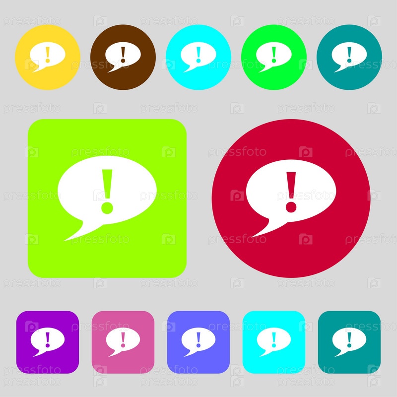 Знак восклицательный знак. Внимание речи пузырь символ. 12 цветных кнопок. Плоский дизайн. Вектор