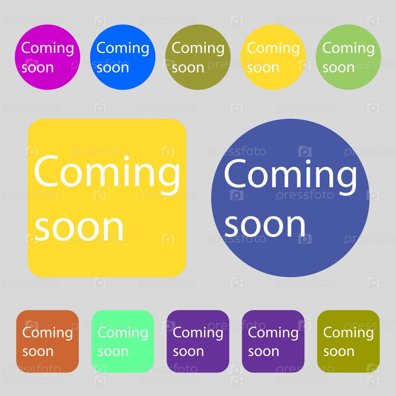 Приходить скоро значок. Продвижение объявление символ. 12 цветных кнопок. Плоский дизайн. Вектор