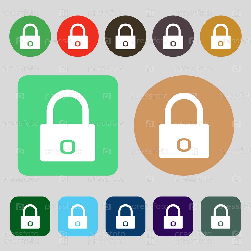 Значок замка знак. Локера символ. 12 цветных кнопок. Плоский дизайн. Вектор