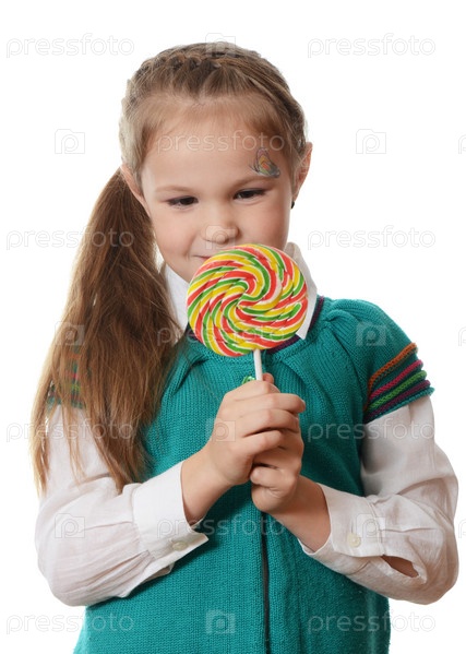 Маленькая девочка с леденец, изолированные на белом фоне