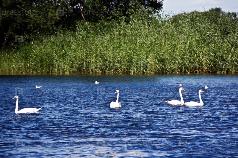 Лебеди плавют в озере летним днем