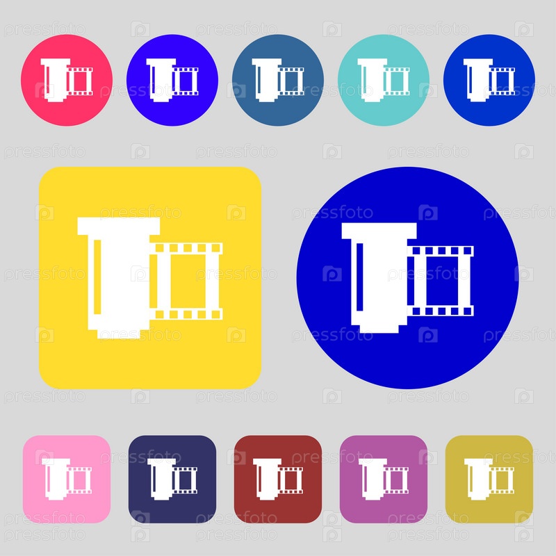 Негативных пленок значок символ. 12 цветных кнопок. Плоский дизайн. Вектор
