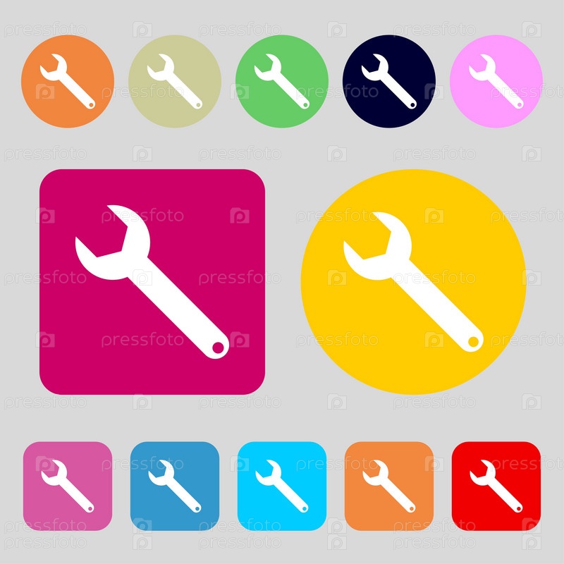 Значок гаечного ключа. Значок службы инструмента. 12 цветных кнопок. Плоский дизайн. Вектор