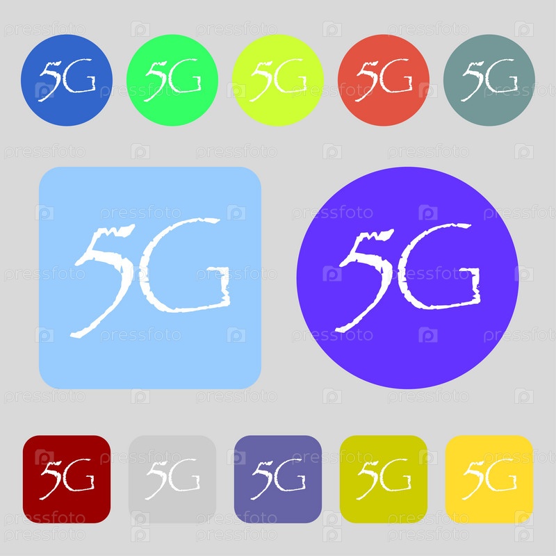 Знак значка 5G. Символ технологии мобильной связи. 12 цветовых кнопок. Плоский дизайн. Вектор