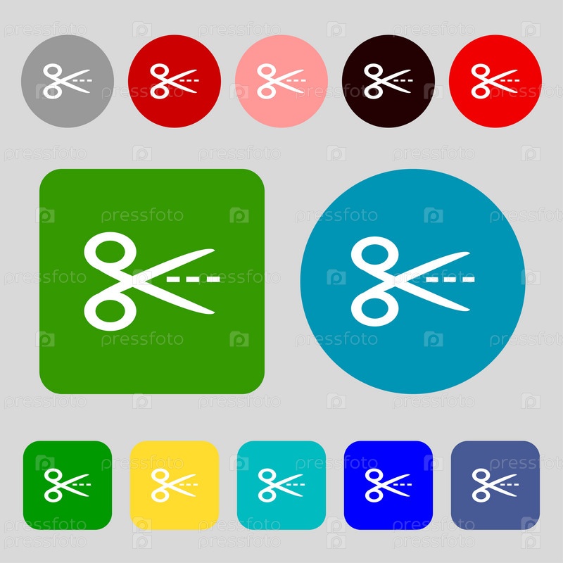 Ножницы с пунктирной линией знак значок. Портной символ. 12 цветных кнопок. Плоский дизайн. Вектор
