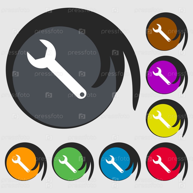 Значок гаечного ключа. Значок службы инструмента. Символы на восьми цветных кнопок. Вектор