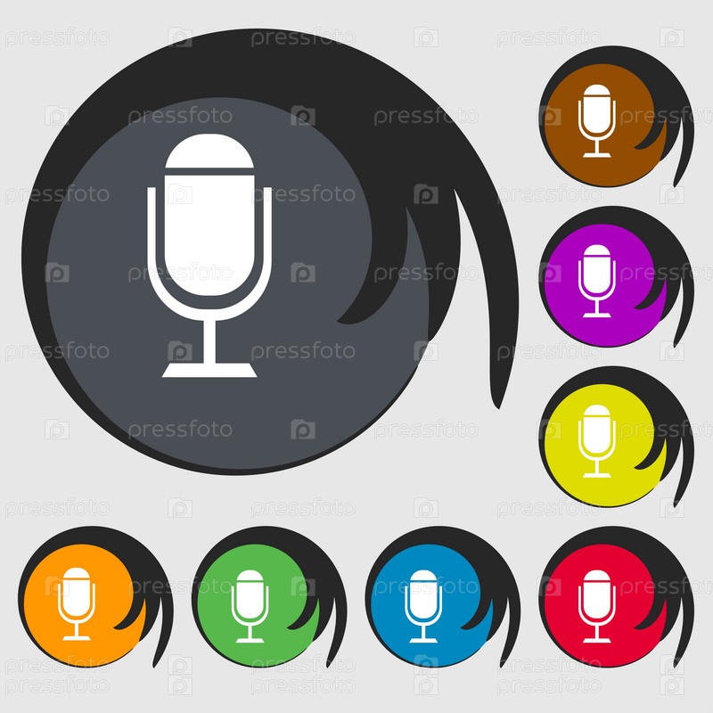 Значок микрофона. Символ динамика. Живая музыка знак. Символы на восьми цветных кнопок. Вектор