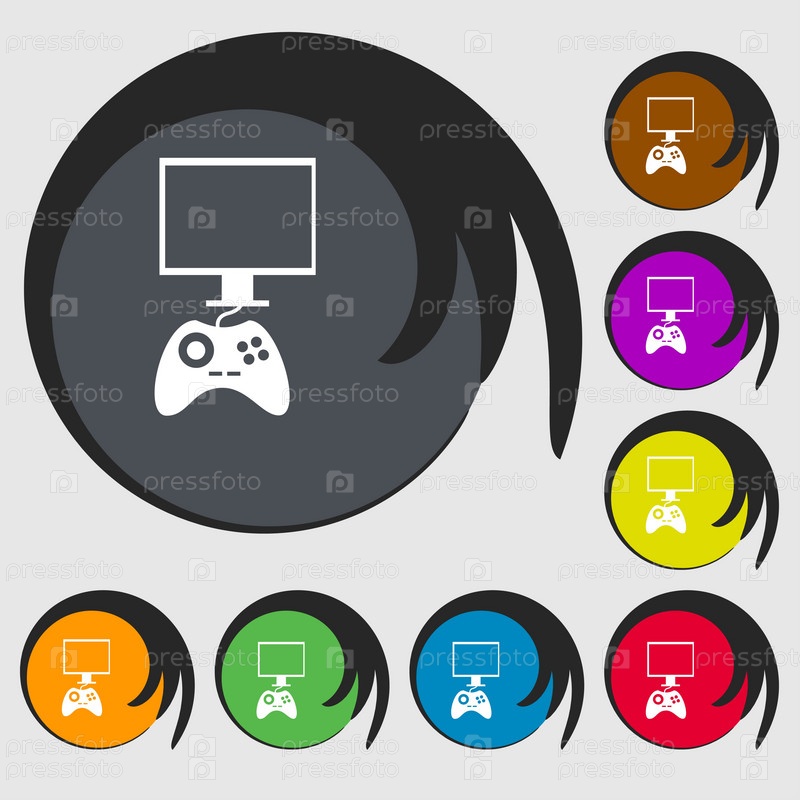 Джойстик и монитор знак значок. Видео игры символ. Символы на восьми цветных кнопок. Вектор