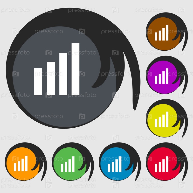 Знак мобильного сигнала. Символ Wi-Fi. Иконка беспроводной сети. Зона WiFi. Символы на восьми цветных кнопках. Вектор