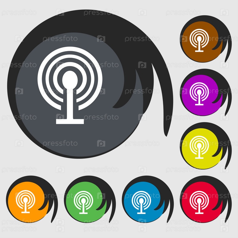 Знак Wi-Fi. Символ Wi-fi. Беспроводная сеть значок зоны. Символы на восьми цветных кнопках. Вектор