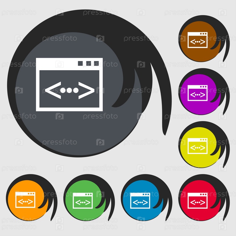Код знака значок. Символ программист. Символы на восьми цветных кнопок. Вектор