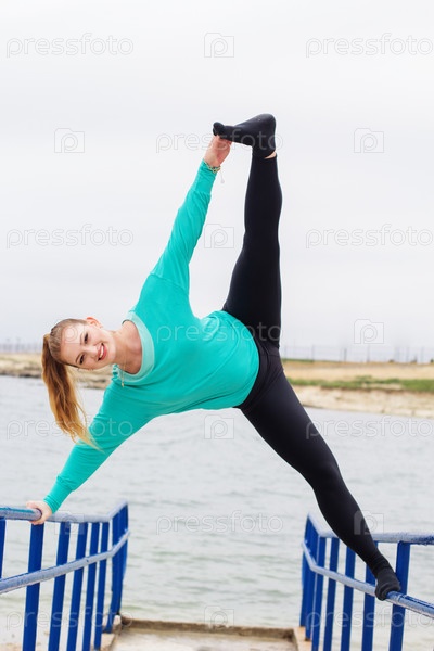 Спортивная девушка делать Сплит на перекладину