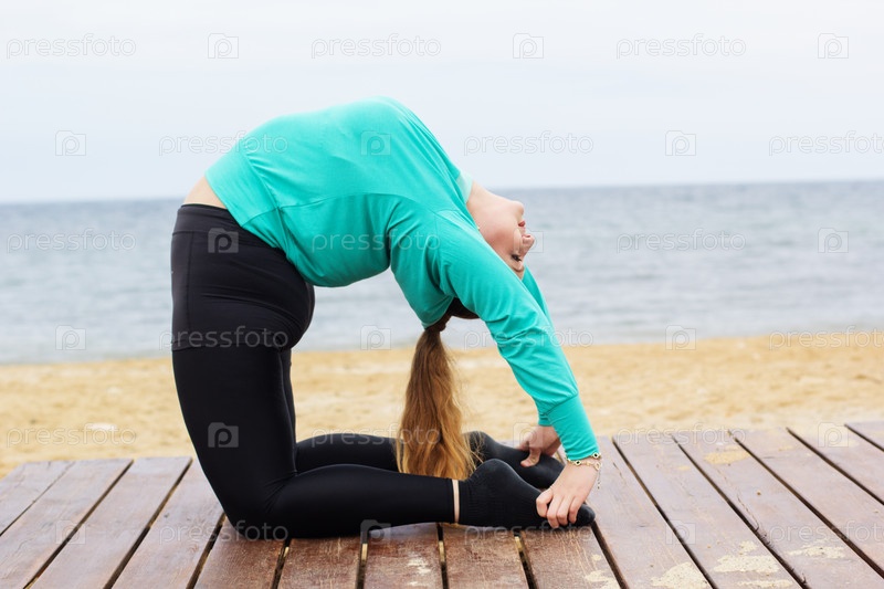 Женщина делает Хатха Йога Асана на берегу моря