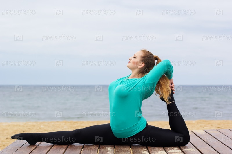 Женщина делает шпагат на берегу моря