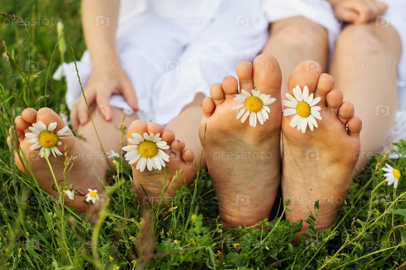 Ноги с цветами ромашки на зеленой траве