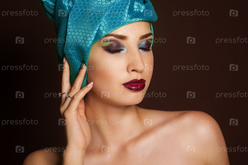 Красивая девушка с мода синий тюрбан на голове