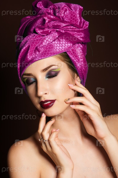 Красивая девушка с моды фиолетовый тюрбан на голове