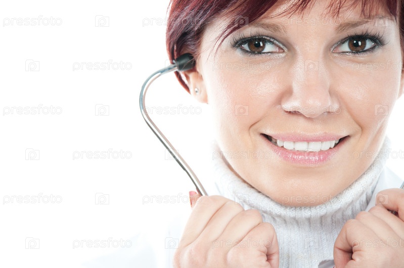 Крупным планом молодая улыбающаяся женщина-врач со стетоскопом, белый фон, место для текста