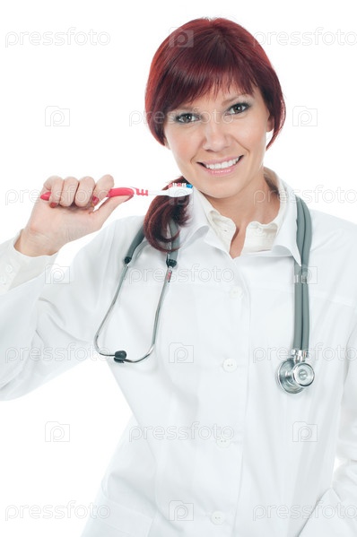 Молодая улыбающаяся женщина-врач с зубной щеткой на белом фоне