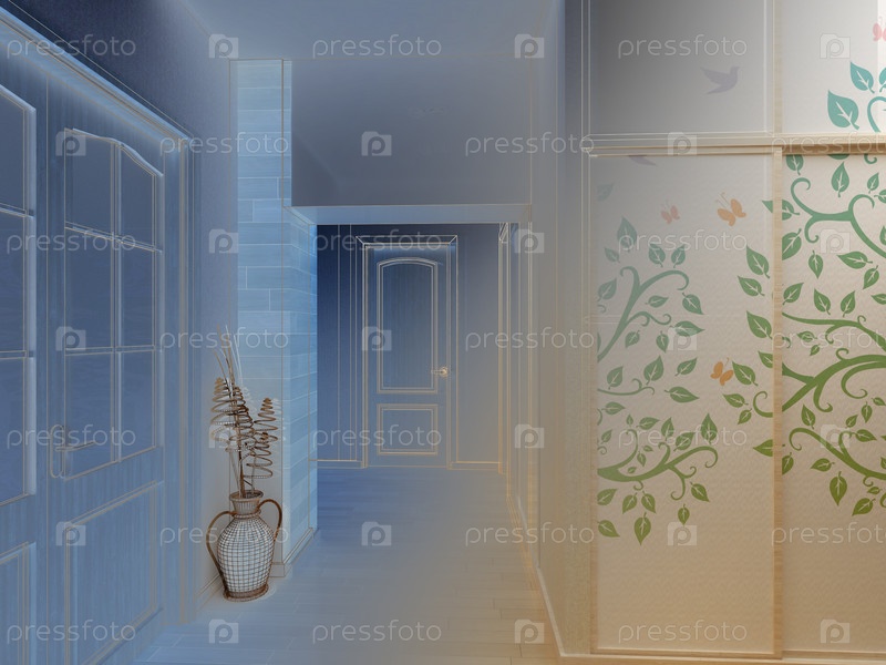 Современный дизайн интерьера зала, коридора. 3D визуализация