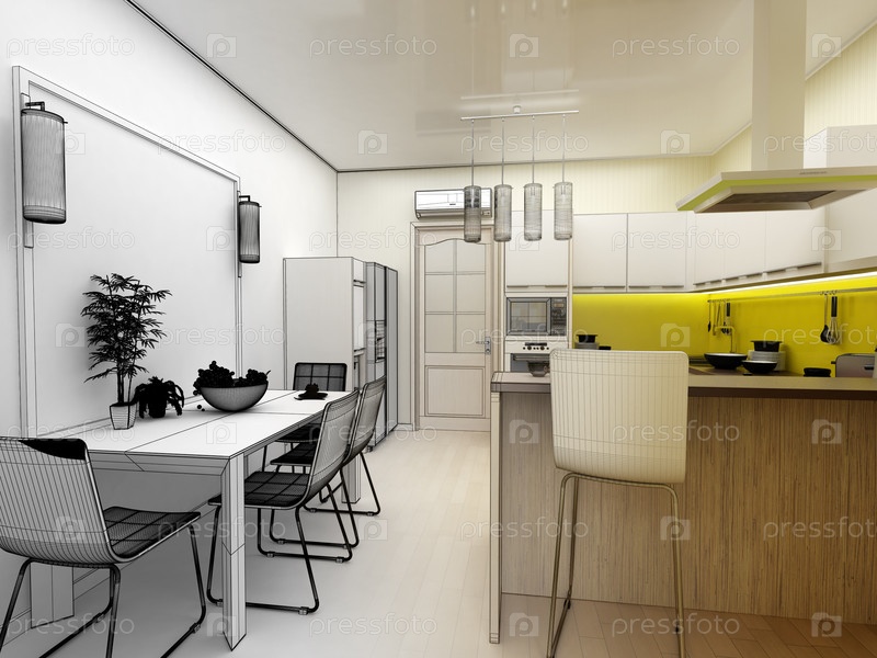 Концепция интерьера 3d желтая современная кухня