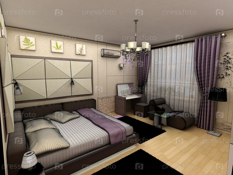 Интерьер 3D спальни с кроватью и окном на улицу