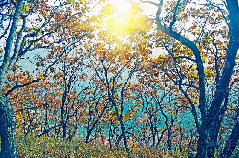 Солнечный свет в листве деревьев на фоне Японского моря в осенний сезон