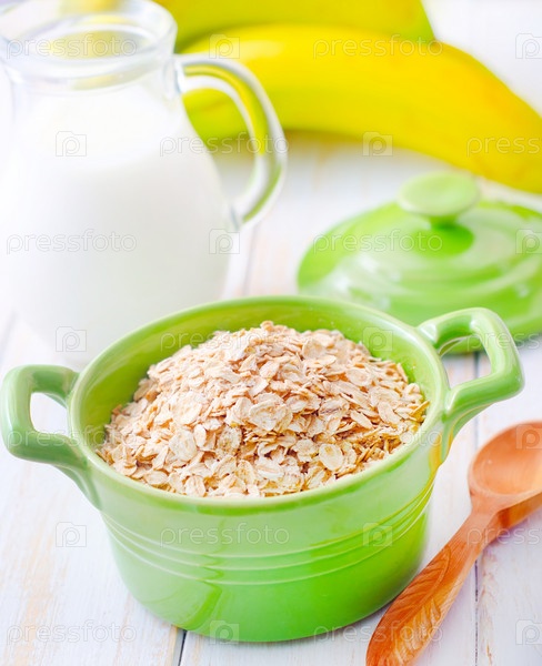 Овсяные хлопья в чашу зеленый банан и молоко