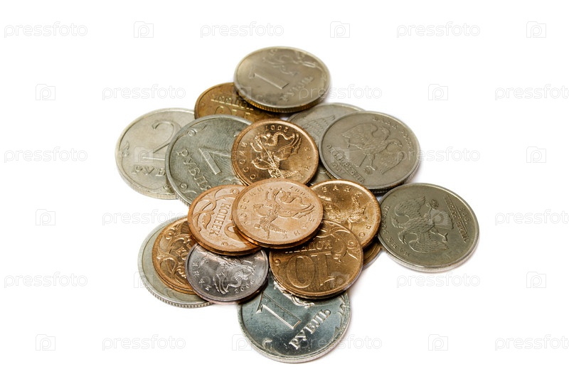 Рублевые и копеечные монеты на белом фоне