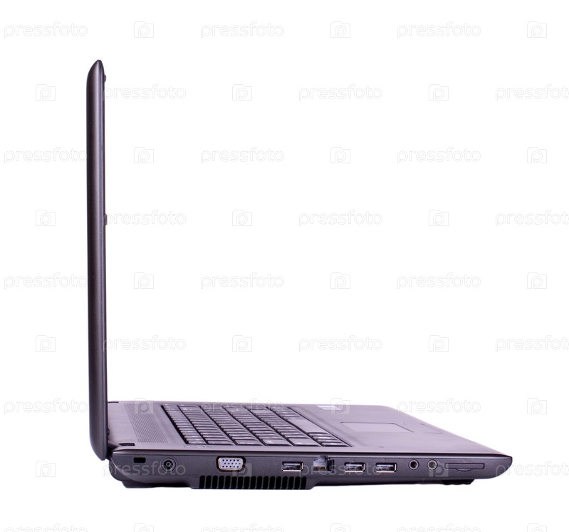 Боковой вид черного портативного компьютера (ноутбука), изолированный на белом