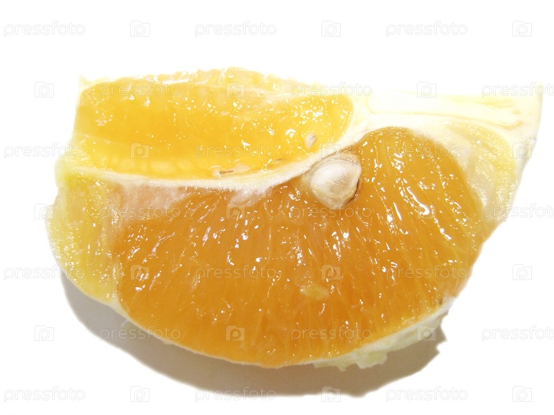 Долька мандарина с косточкой на белом фоне
