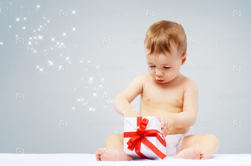 Маленький ребенок открывает подарок