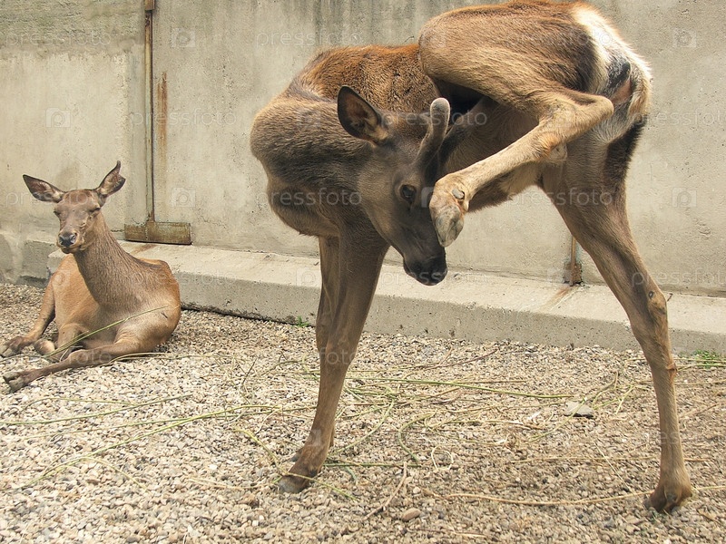 Олень чешет задней лапой нос