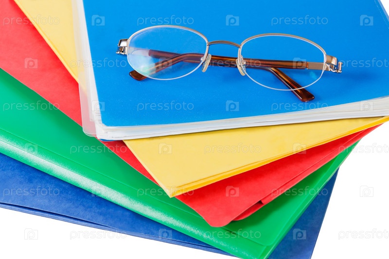 Разноцветные папки с очками на белом фоне