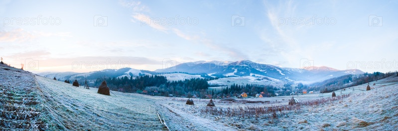 Первые осенние заморозки на пастбище в горной деревне, панорама